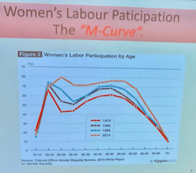 Of course, first there is the question of women’s labor force participation. Doden illustrated this with what she called an “M curve”—referencing both its shape and the first letter of the act that contributes to its shape: marriage.