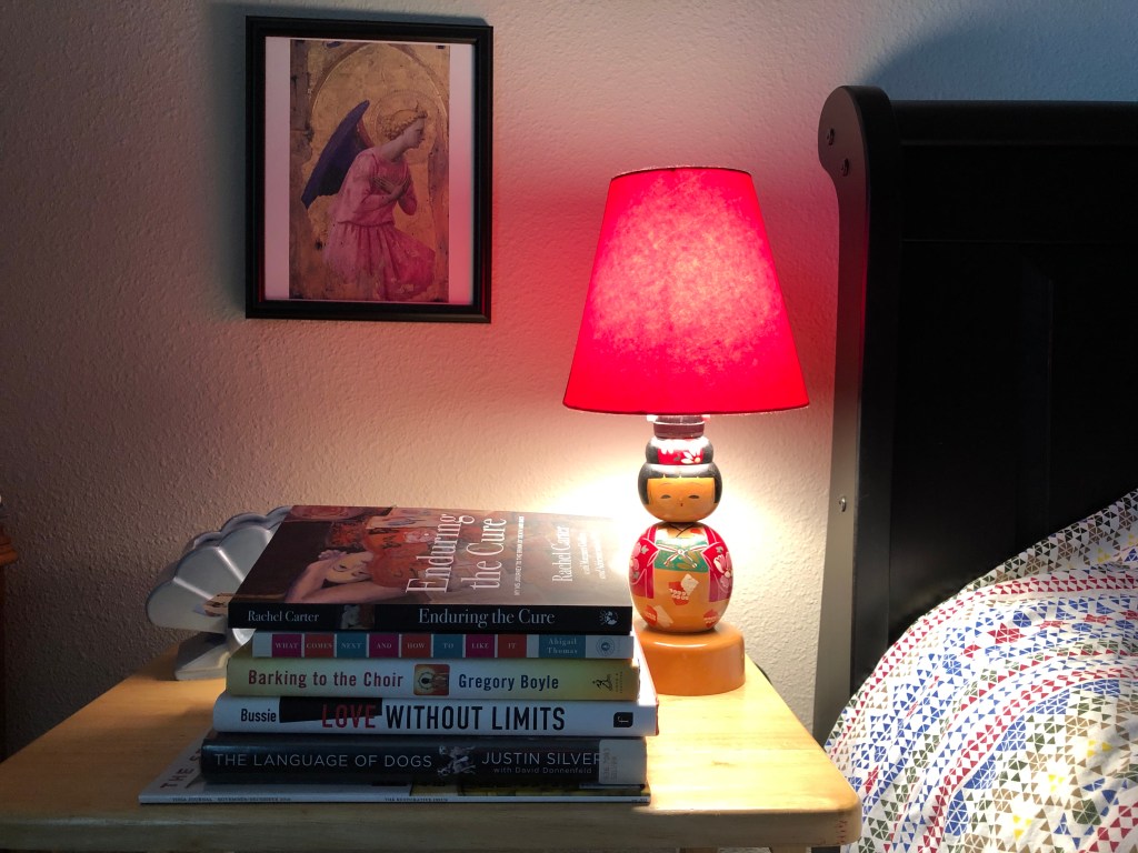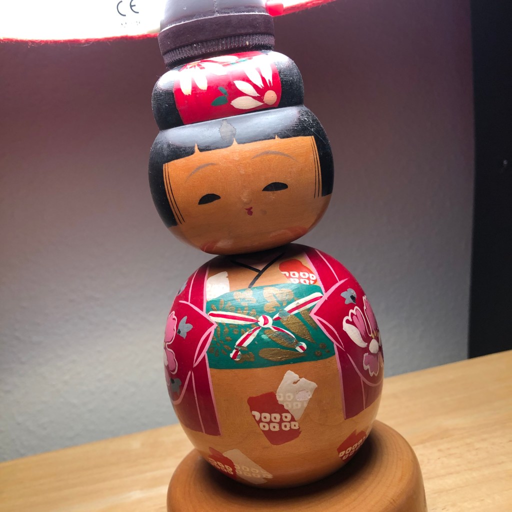 She is a kokeshi doll lamp that my mother acquired in the 1950s or ’60s in Saskatchewan. I remember her standing sentinel on my dresser when I was a child, and almost ever since she has dwelt on my dresser or nightstand.