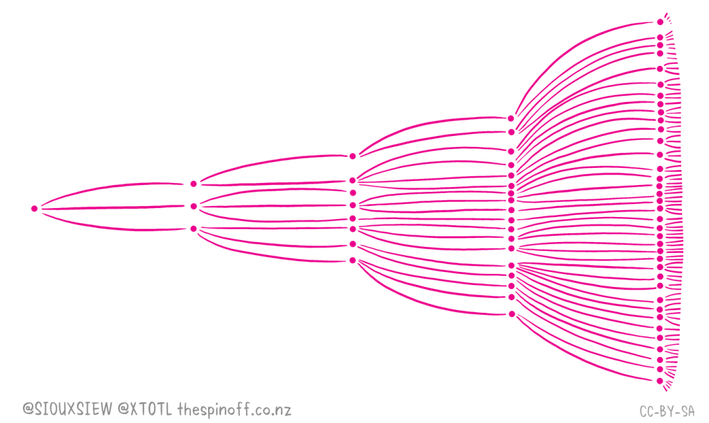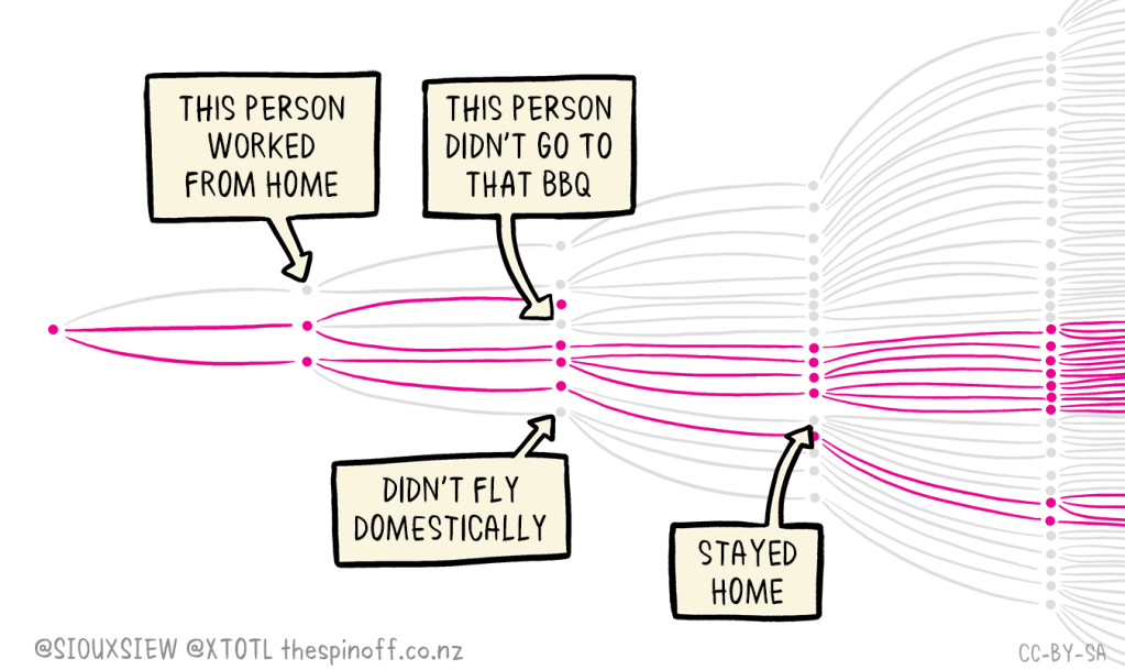 The first is a depiction of the spread of COVID-19 by New Zealand cartoonist Toby Morris. It shows how one person can spread it to a few others, who spread it to a few others each and so on:
