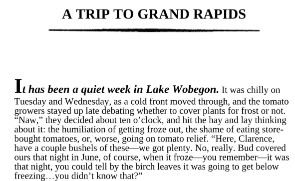 The way he captures my homeland, Minnesota, and builds personalities and lives around his characters, causing me both to laugh at and sympathize with them, and always love them.