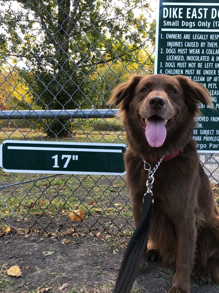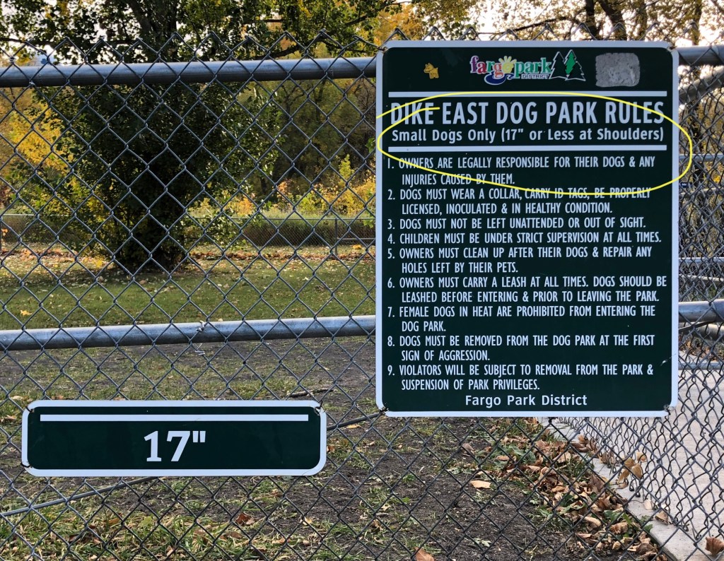 The other reason I smiled this morning — laughed out loud, actually — had to do with a sign I saw at a dog park we passed. The fence was about waist-high, and the sign indicated that area was only for small dogs — 17 inches or less at shoulders.