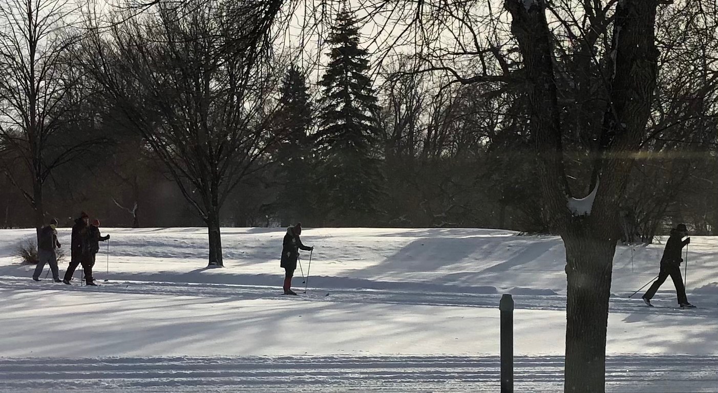 Traffic on a snowy Sunday: several pickup trucks and sedans, one super-fat-tired bicycle and four cross-country skiers.