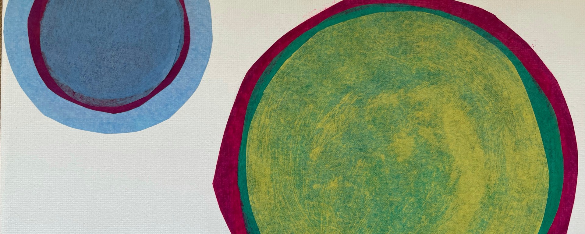 I’ve been experimenting with how best to represent these gorgeous stone eyes and currently have a few drafts sitting in the dining room. The one I happened to look at while thinking about my moon shot is just partially complete. It includes the beginnings of two eyes, one cool and blue, one warm with red, green and yellow concentric circles. Darned if that draft gemstone project didn’t start to resemble the moon and earth.